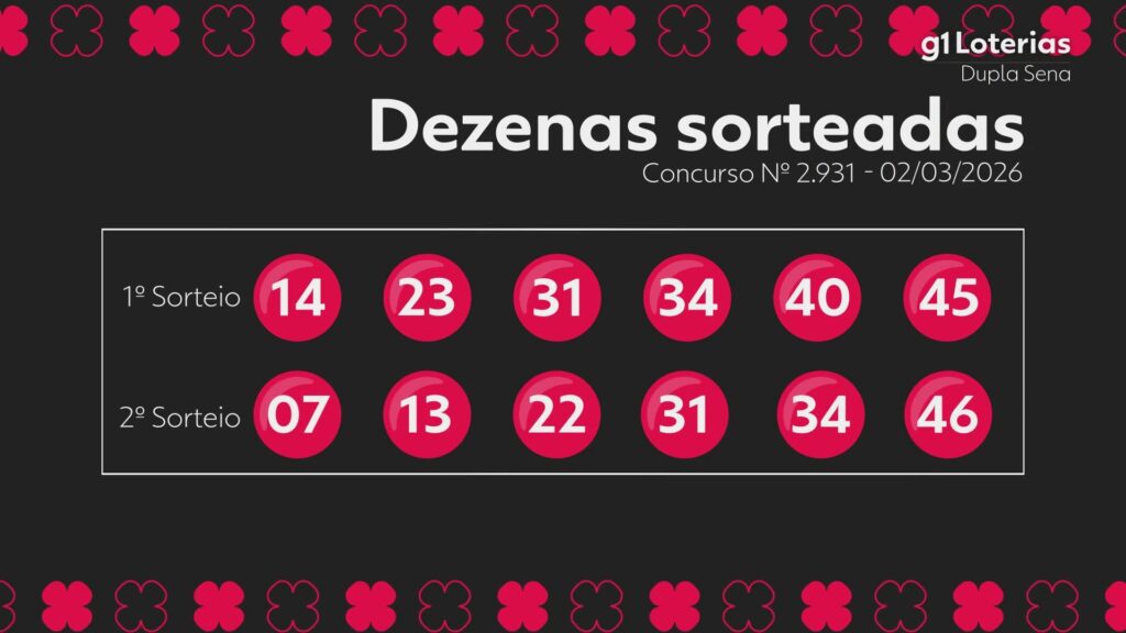 Resultado da Dupla Sena g1 Veja abaixo os números do sorteio do concurso 2931 da Dupla Sena realizado nesta segunda-feira (2): 1º sorteio: 14 - 23 - 31 - 34 - 40 - 45 2º sorteio: 7 - 13 - 22 - 31 - 34 - 46 Confira o resultado do sorteio da Dupla Sena. Veja quantas apostas foram premiadas no concurso 2931: 1º sorteio: Ninguém conseguiu os 6 acertos, e a premiação acumulou para R$ 3,5 milhões; 5 acertos: 7 apostas ganh