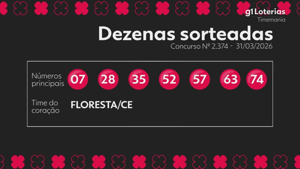 Resultado da Timemania g1 Veja abaixo os números do sorteio do concurso 2374 da Timemania realizado nesta terça-feira (31): Dezenas: 7 - 28 - 35 - 52 - 57 - 63 - 74 Time do Coração: FLORESTA/CE Confira o resultado do sorteio da Timemania. Veja quantas apostas foram premiadas no concurso 2374: Ninguém conseguiu os 7 acertos, e a premiação acumulou para R$ 15,6 milhões; 6 acertos: 5 apostas ganhadoras, cada uma vai rec
