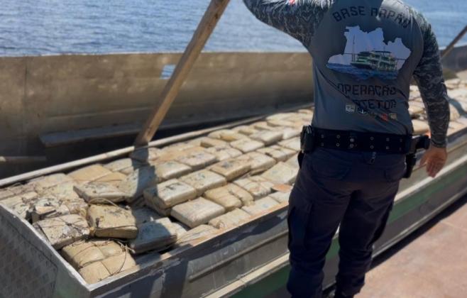 A Polícia Militar do Amazonas (PMAM) localizou, na quinta-feira (26/03), mais de 260 quilos de entorpecentes que estavam escondidos no interior de um bote de alumínio, nas proximidades de Barcelos (a 399 quilômetros de Manaus). A ação foi realizada na Base Arpão 3, durante vistoria em uma embarcação que havia sido apreendida em outra ocorrência. Por volta das 9h30, a equipe policial realizava a inspeção na embarcação