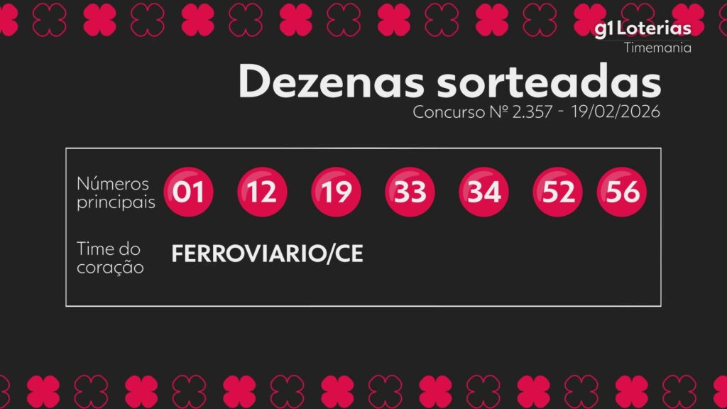 Resultado da Timemania g1 Veja abaixo os números do sorteio do concurso 2357 da Timemania realizado nesta quinta-feira (19): Dezenas: 1 - 12 - 19 - 33 - 34 - 52 - 56 Time do Coração: FERROVIARIO/CE Confira o resultado do sorteio da Timemania. Veja quantas apostas foram premiadas no concurso 2357: Ninguém conseguiu os 7 acertos, e a premiação acumulou para R$ 7,5 milhões; 6 acertos: 3 apostas ganhadoras, cada uma vai