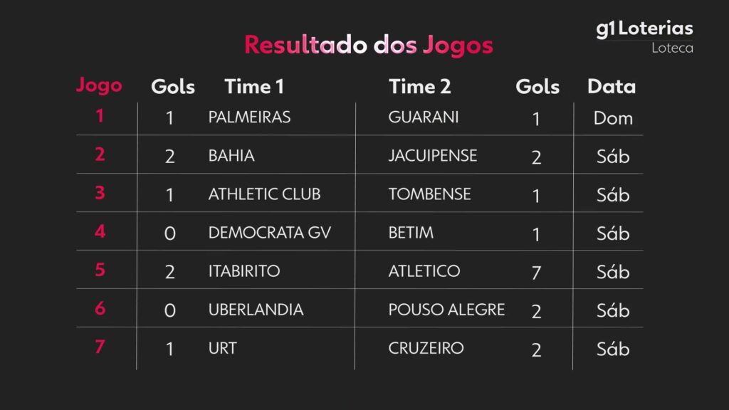 Resultado da Loteca g1 Veja abaixo os resultados dos jogos no concurso 1233 da Loteca realizado nesta quarta-feira (18): Resultado dos Jogos Confira o resultado do sorteio da Loteca. Veja quantas apostas foram premiadas no concurso 1233: Ninguém conseguiu os 14 acertos, e a premiação acumulou para R$ 7 milhões; 2º (13 acertos): 13 apostas ganhadoras, cada uma vai receber R$ 24.672,97. O próximo sorteio acontece no co