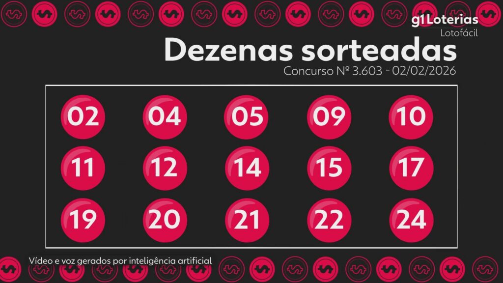 Resultado da Lotofácil g1 Veja abaixo os números do sorteio do concurso 3603 da Lotofácil realizado nesta segunda-feira (2): 2 - 4 - 5 - 9 - 10 - 11 - 12 - 14 - 15 - 17 - 19 - 20 - 21 - 22 - 24 Confira o resultado do sorteio da Lotofácil. Veja quantas apostas foram premiadas no concurso 3603: 15 acertos: 2 apostas ganhadoras, cada uma vai receber R$ 813.480,20; 14 acertos: 485 apostas ganhadoras, cada uma vai receber