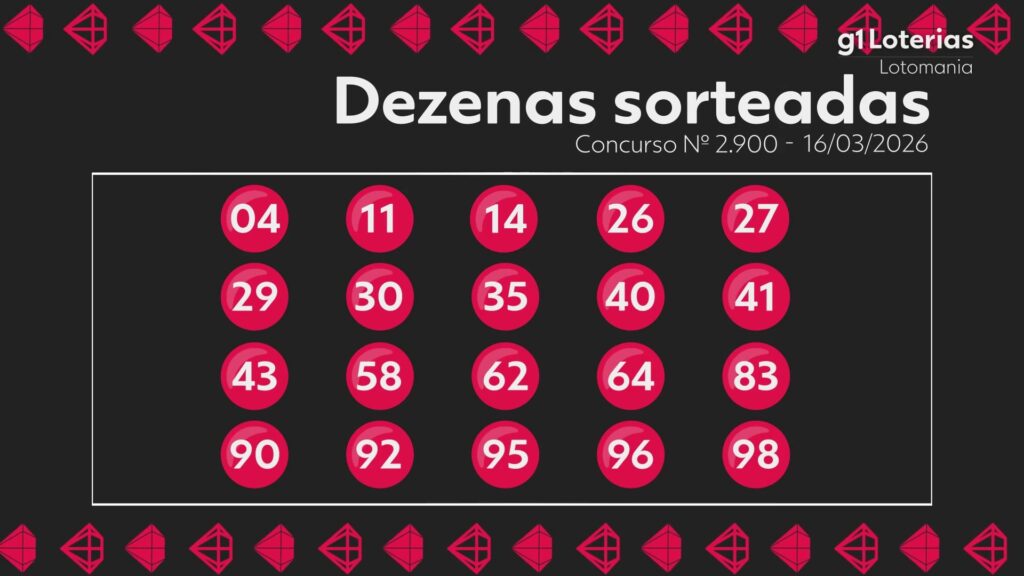 Resultado da Lotomania g1 Veja abaixo os números do sorteio do concurso 2900 da Lotomania realizado nesta segunda-feira (16): 4 - 11 - 14 - 26 - 27 - 29 - 30 - 35 - 40 - 41 - 43 - 58 - 62 - 64 - 83 - 90 - 92 - 95 - 96 - 98 Confira o resultado do sorteio da Lotomania. Veja quantas apostas foram premiadas no concurso 2900: Ninguém conseguiu os 20 acertos, e a premiação acumulou para R$ 5 milhões; 19 acertos: 1 aposta g