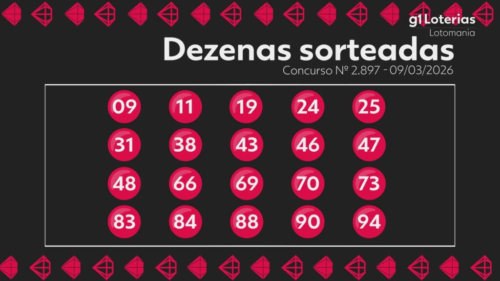 Resultado da Lotomania g1 Veja abaixo os números do sorteio do concurso 2897 da Lotomania realizado nesta segunda-feira (9): 9 - 11 - 19 - 24 - 25 - 31 - 38 - 43 - 46 - 47 - 48 - 66 - 69 - 70 - 73 - 83 - 84 - 88 - 90 - 94 Confira o resultado do sorteio da Lotomania. Veja quantas apostas foram premiadas no concurso 2897: Ninguém conseguiu os 20 acertos, e a premiação acumulou para R$ 2,6 milhões; 19 acertos: 2 apostas