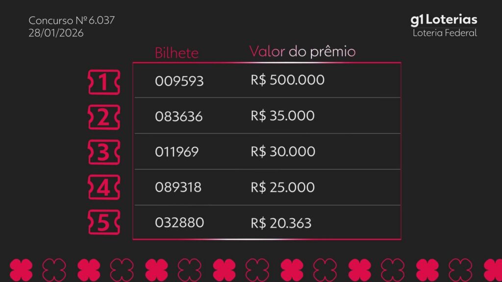 Resultado da Loteria Federal g1 Veja abaixo os bilhetes sorteados do concurso 6037 da Loteria Federal realizado nesta quarta-feira (28): 1º - Bilhete 009593: R$ 500.000 2º - Bilhete 083636: R$ 35.000 3º - Bilhete 011969: R$ 30.000 4º - Bilhete 089318: R$ 25.000 5º - Bilhete 032880: R$ 20.363 Confira o resultado do sorteio da Loteria Federal. O próximo sorteio acontece no sábado (31). 📱Baixe o app do g1 para ver notíc